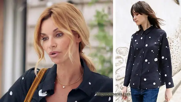 Le jour d’Halloween (Demain nous appartient 585), Chloé (Ingrid Chauvin) portait pour ce chemisier noir, non pas à pois, comme nous l’avions d’abord cru, mais avec avec un imprimé qui représente une nuit étoilée et une série de lunes à visages.