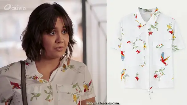 Noor Beddiar (Sahelle De Figueiredo) essaie de persuader Victoire de rester à Sète dans DNA 549. Elle porte une chemise à courtes manches ornées de fleurs et de perroquets. On la trouve ici à 9,99€