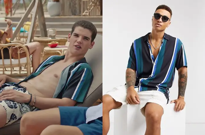 Gabriel (Martin Mille) lance un défi à Arthur dans Demain nous appartient 740. Il porte une chemise à rayures bleues et vertes. On la trouve ici.