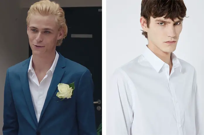 Bart (Hector Langevin) a remis le costume qu’il portait au mariage de Dylan pour assister à celui de sa grand-mère, dans Demain nous appartient 731. Il a, cependant, acheté une jolie chemise blanche, au col classique. On la trouve ici