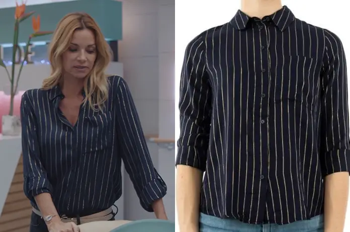 Chloé (Ingrid Chauvin) dans les couloirs de l’hôpital dans l’épisode 819 de Demain nous appartient. Elle porte son chemisier bleu nuit à rayures dorées. On le trouve encore ici.
