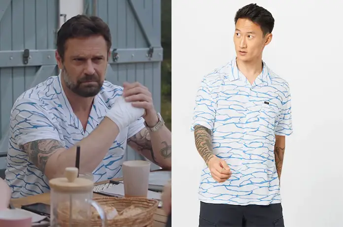 Sacha Girard prenait le petit déj dans une chemise à courtes manches avec des dessins bleu clair dans Demain nous appartient 958. On la trouve ici (France) ou ici (Belgique)