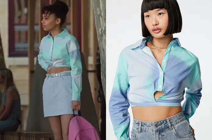 Dans Demain nous appartient 1205, Angie (Louise Marion) porte une chemise dans un bleu délavé…le bas de la chemise se ferme par un cordon.