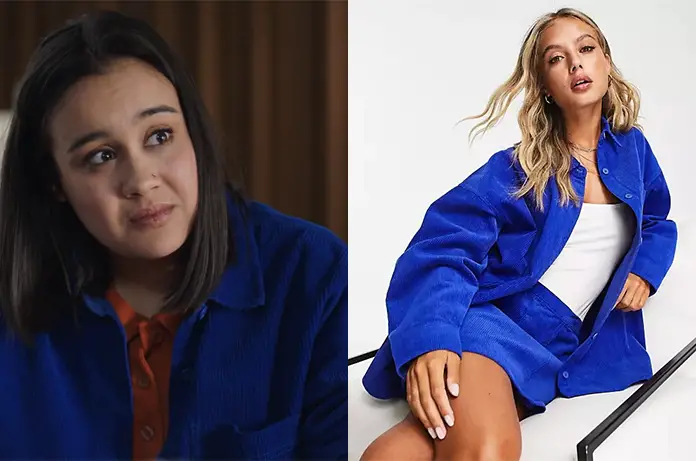 Noor (Sahelle De Figueiredo) porte une chemise bleue, en velours, dans Demain nous appartient.