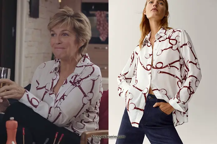 Anne-Marie (Véronique Jannot) retrouve sa fille dans l’épisode 815 de Demain nous appartient. Elle porte un élégant chemisier blanc imprimé chaines. On le trouve ici.