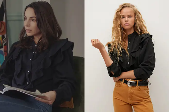 Louise (Alexandra Naoum) portait cette jolie chemise noire à volants dans Demain nous appartient 860. Il s’agit du modèle Luna de Mango, en rupture de stock