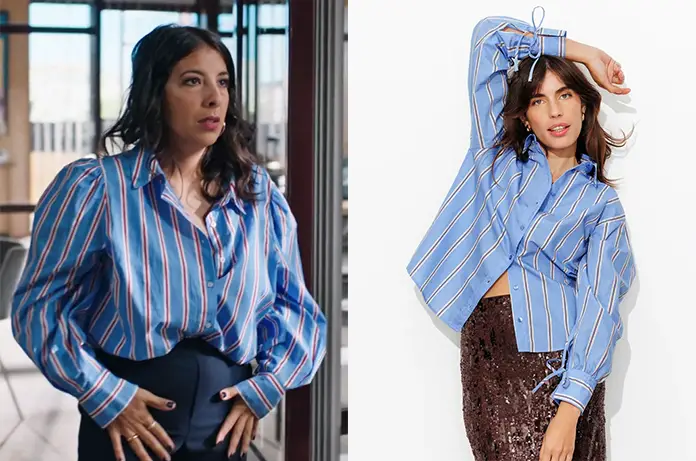 Soraya (Kenza Saib Couton) demande quelques explications à Gabriel dans Demain nous appartient épisode 2078. Elle porte une chemise bleue oversize, à rayures.