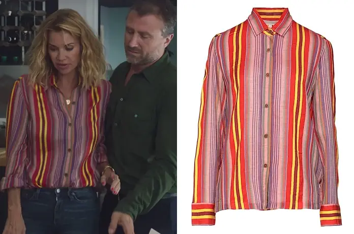 Chloé (Ingrid Chauvin) a organisé un repas de famille dans Demain nous appartient 1045. Elle porte une chemise à rayures. De la marque Vanessa Bruno, on la trouvait ici.