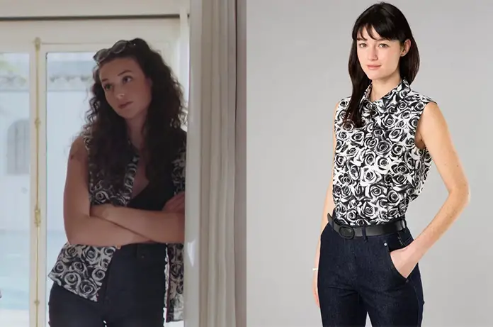 Dans Demain nous appartient 963, Manon (Louvia Bachelier) porte une chemise sans manches, avec des roses en imprimé noir et blanc.