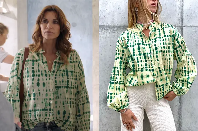 Chloé (Ingrid Chauvin) s’inquiète pour sa fille dans Demain nous appartient épisode 1987. Elle porte dans l’épisode une chemise tie dye de Scarlet Roos que l’on trouve encore en seconde main.