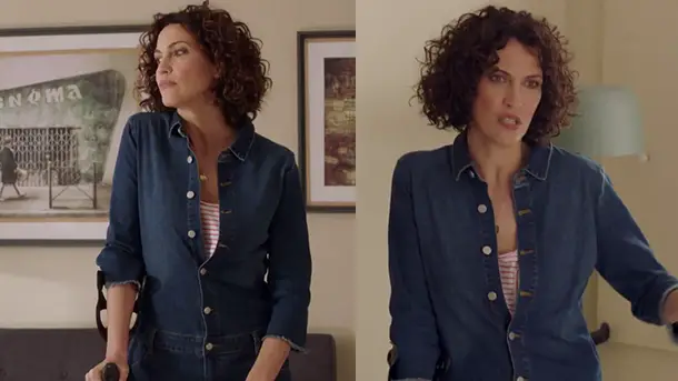 Dans l’épisode 444 de Demain nous appartient, Clémentine (Linda Hardy) est plongée dans le doute à propos de son histoire avec Maxime. Elle porte à merveille une combinaison en jeans. On la trouvait chez Vila Global. On en trouve encore de couleur plus claire ici.