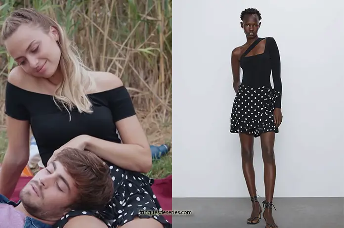 La romance se poursuit entre Maxime et Salomé (Aurélie Pons) dans Demain nous appartient 780. La jeune femme portait une jupe à pois assez courte que l’on trouve ici