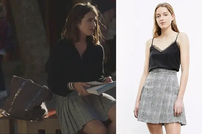Charlie Molina (Clémence Lassalas) portait une très jolie jupe grise en laine, style tweed, dans Demain nous appartient 1041. On la trouve ici