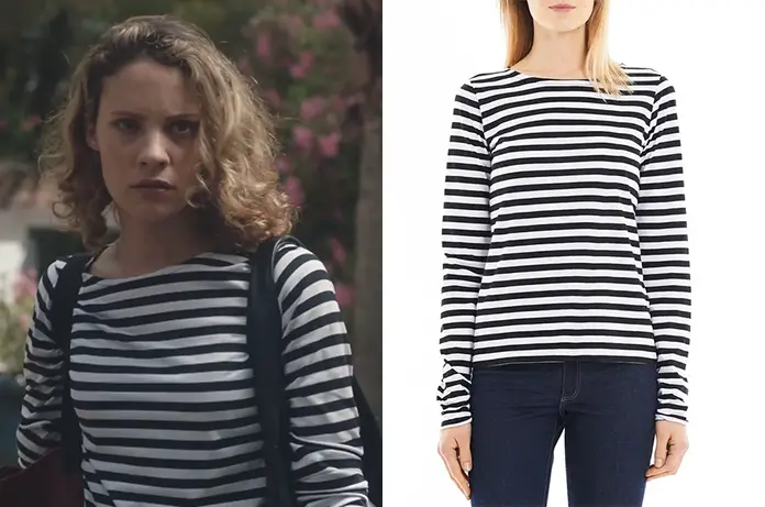 Dans Demain nous appartient 996, voici la tête très surprise d’Alma (Camille De Pazzis) quand elle rentre chez elle de vacances. Elle porte un t-shirt à rayures que l’on trouve ici
