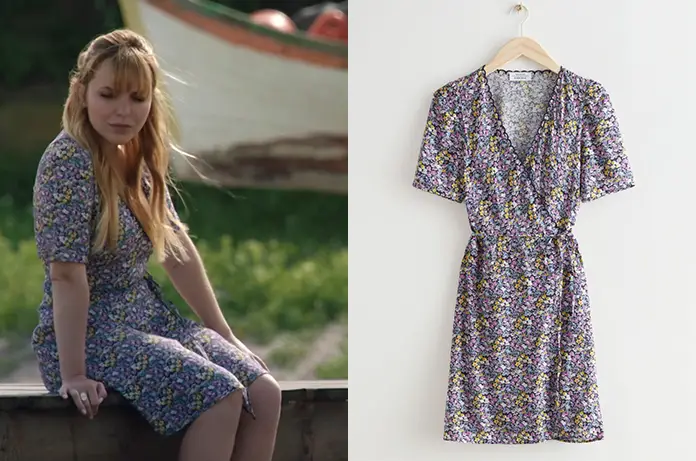 Judith (Alice Varela) en pleine réflexion dans le nouveau mas de la famille. Dans Demain nous appartient 1206, elle porte cette robe violette à motif floral.