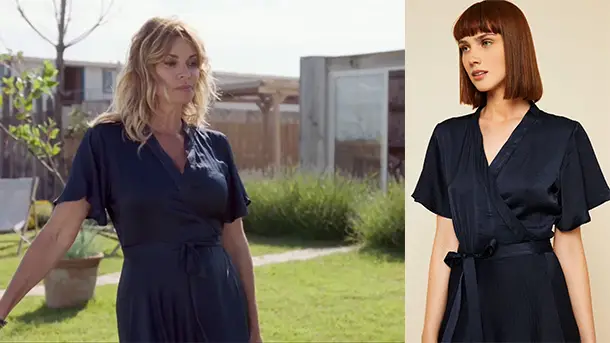 Chloé (Ingrid Chauvin) est furieuse contre sa mère dans l’épisode 259 de Demain nous appartient. Elle le lui fait bien savoir, habillée d’une robe portefeuille bleu marine.