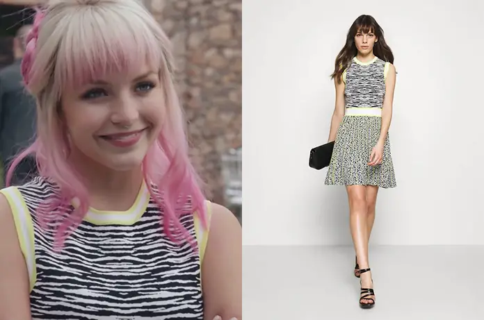 Judith (Alice Varela) portait une très élégante robe patineuse avec deux motifs animaliers différents pour le mariage de sa grand-mère dans Demain nous appartient 4×731.