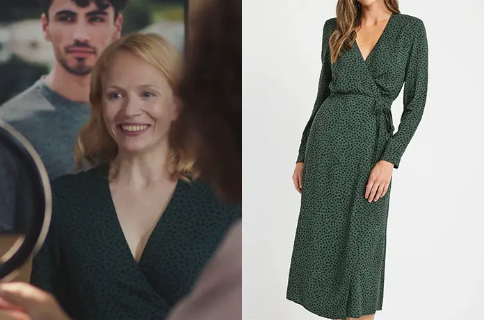 Lætitia (Clémentine Verdier) continue d’apprendre des choses sur son fils dans Demain nous appartient 1012. Mais elle continue de défendre Clément… et même devant le monde entier s’il le faut. Elle porte une robe portefeuille verte tachetée de noir. On la trouve ici