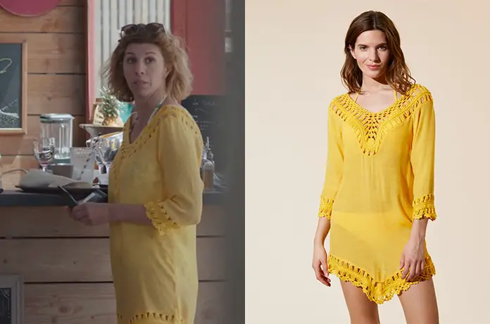 Sandrine (Juliette Tresanini) portait une tunique de plage jaune vif dans Demain nous appartient 689. On la trouve ici en divers coloris