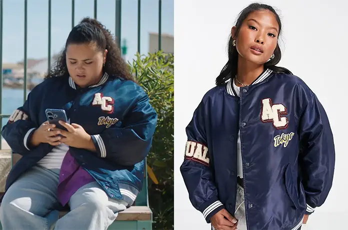 Lizzie (Juliette Mabilat) consulte ses réseaux dans cette veste bleue dans Demain nous appartient épisode 1320 : un modèle Asos en rupture de stock.