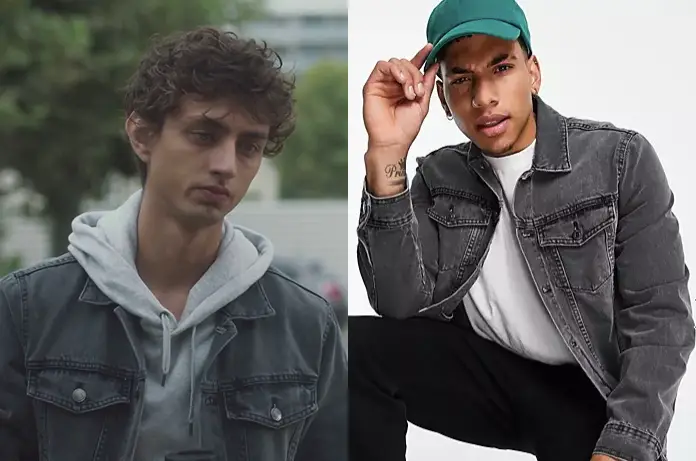 Jordan (Maxime Lélue) sort de l’hôpital avec cette petite veste grise, en denim, dans Demain nous appartient 1049. On la trouve ici