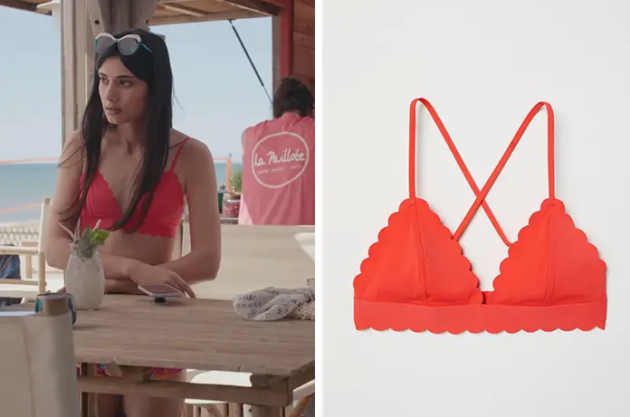 Dans Demain nous appartient 965, Camille (Elisa Ezzedine) sirote son cocktail en portant un haut de bikini corail, au bord festonné. On le trouvait chez H&M (Rupture de stock).