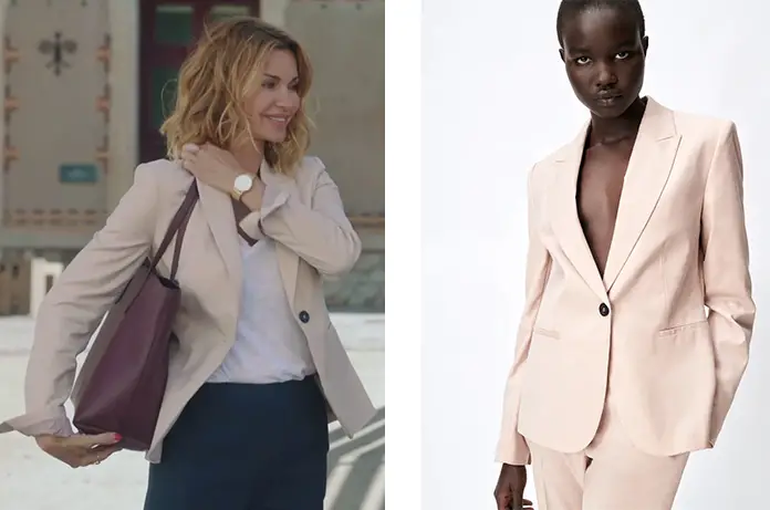 La CPE trouve que Chloé (Ingrid Chauvin) a une tenue trop stricte pour sa rentrée dans Demain nous appartient 1005. Vous trouvez ? Ce ravissant blazer rose poudré se trouve ici.