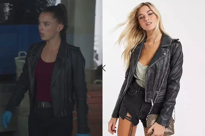 Sara Raynaud (Camille Genau) est en intervention dans Demain nous appartient 1040. Elle porte un blouson en cuir actuellement en promo ici