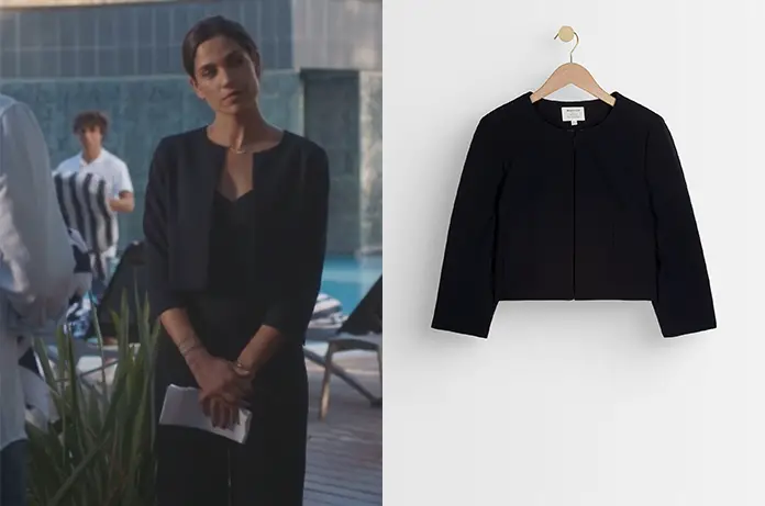 Lisa Hassan (Naïma Rodric) porte ce petit boléro marine tout mignon dans Demain nous appartient 127.
