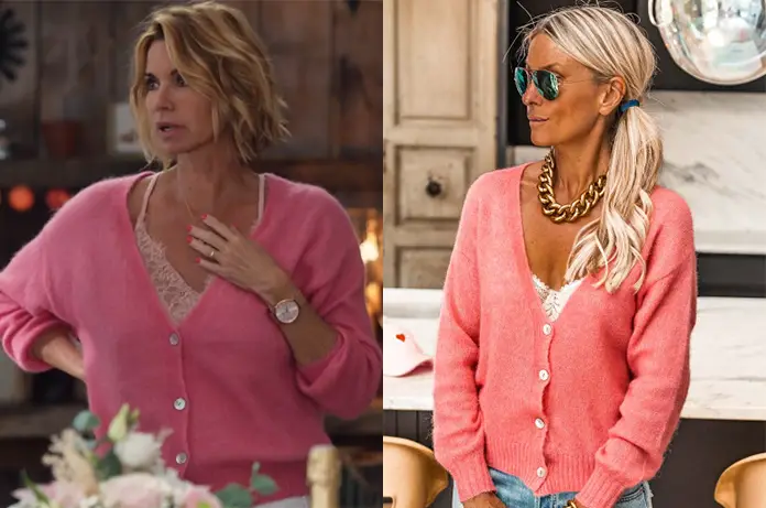 Pour l’anniversaire de son beau-père, dans Demain nous appartient épisode 1340, Chloé (Ingrid Chauvin) a choisi un petit cardigan rose. Il s’agit du modèle Olga de la marque Grungemama. Seule la version verte (taille unique) existe encore sur son site.