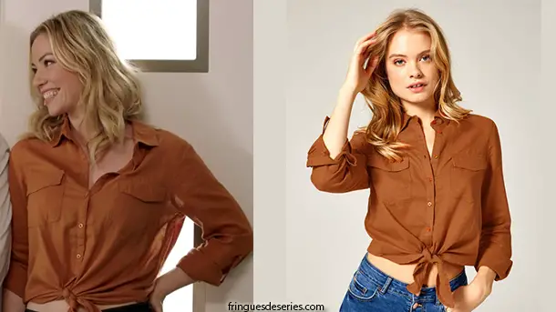 Anna (Maud Baecker ) semble vivre un nouveau bonheur dans l’épisode 481 de Demain nous appartient. On retrouve ici le chemisier à nouer camel qu’elle porte.