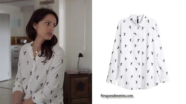 Béatrice Raynaud (Sophie Michard) porte un chemisier avec des jolis oiseaux imprimés dans l’épisode 184 de Demain nous appartient. On le trouve ici pour 14,99 €