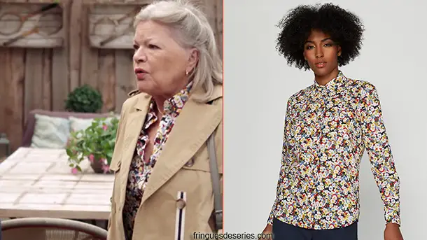 Jeanne (Catherine Allégret) s’installe dans la chambre de Judith dans l’épisode 598 de DNA. Elle porte une chemise fleurie dispo ici