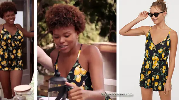 Pour son premier ptit déj chez les Moreno, Jenny (Chanel Victor) a choisi un combishort imprimé citrons dans Demain nous appartient 528. On le trouvait ici. Merci à la perspicacité d’Audrey C.