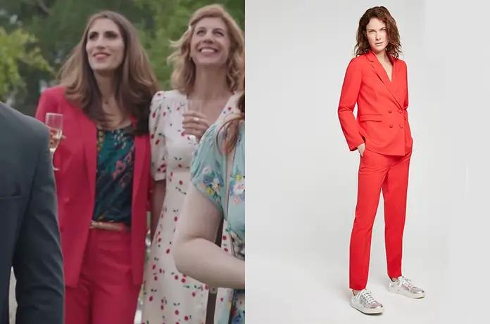 Morgane (Marie Catrix) participait aussi au mariage de Marianne dans Demain nous appartient 731 Elle avait choisi un costume rouge : un blazer à fermeture croisée et un pantalon cigarette. On peut évidemment le porter dépareillé.