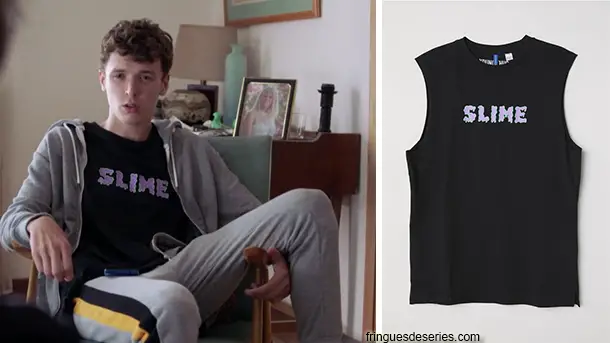 Mathias (Gulliver Benhadj) discute avec son père dans l’épisode 316 de Demain nous appartient. Survêtement et débardeur avec l’inscription « slime ».