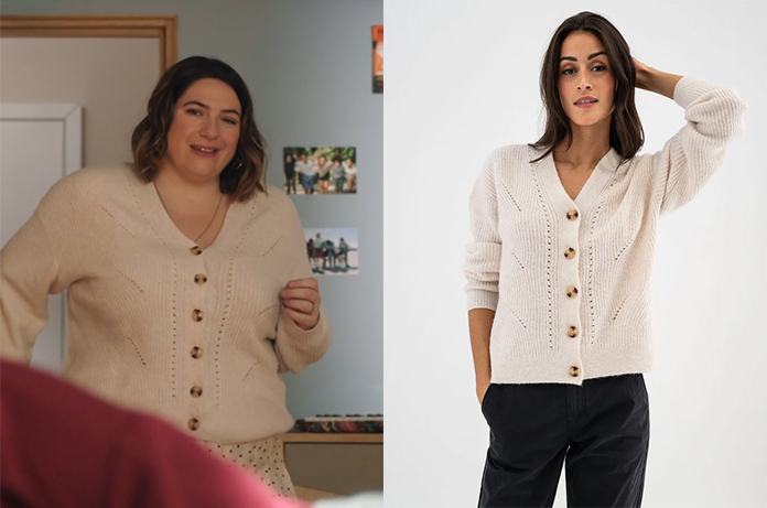 Dans l’épisode 2180 de Demain nous appartient, Audrey Roussel (Charlotte Gaccio) nous offre une scène pleine de tendresse. Lorsqu’elle entre dans la chambre de sa fille pour prendre de ses nouvelles, son look reflète parfaitement son rôle de maman protectrice et bienveillante : elle porte un cardigan col V à la fois simple et ultra-stylé.