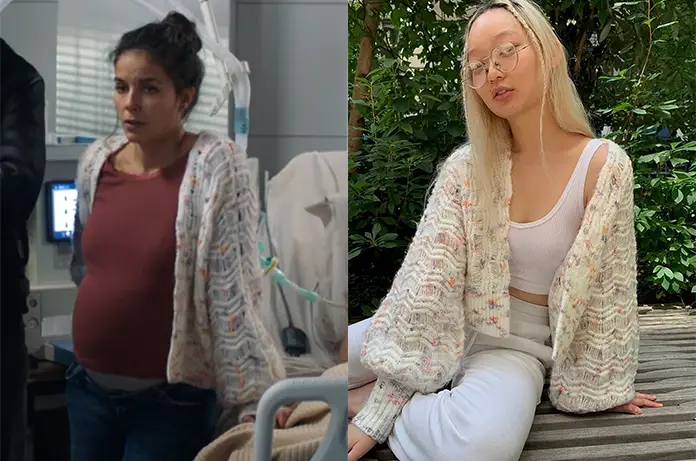 Roxane (Raphaële Volkoff) porte un gilet blanc, manches ballon et fibres entrelacées colorées dans Demain nous appartient 1336.