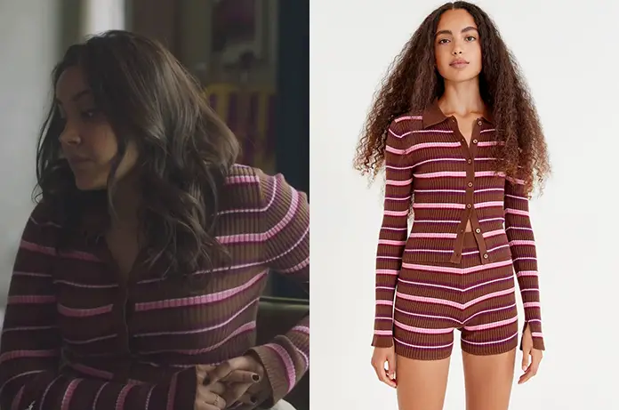 Dans Demain nous appartient 1062, Noor (Sahelle de Figueiredo) a un petit cardigan marron, côtelé avec des rayures roses. On le trouve ici.