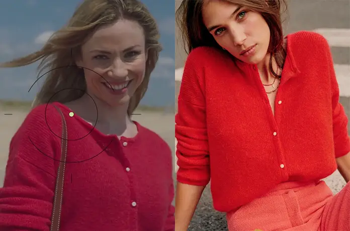Anna (Maud Baecker) se rapproche de Jim dans Demain nous appartient 1040. Elle porte un petit cardigan rouge qu’on trouve ici