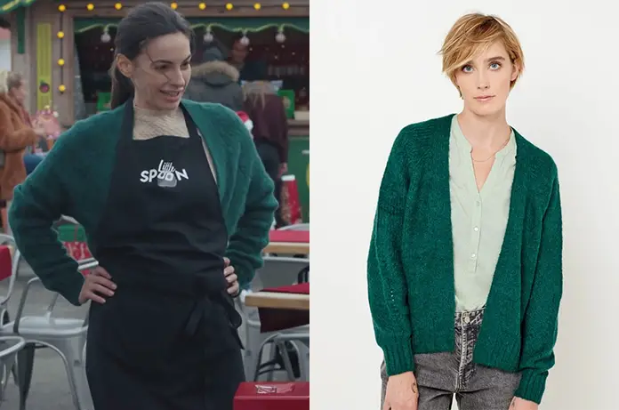 Louise Kersal (Alexandra Naoum) débarque à Sète dans Demain nous appartient 817. Pour une période d’essai au Little Spoon ? Elle porte un gilet vert que l’on trouve ici.