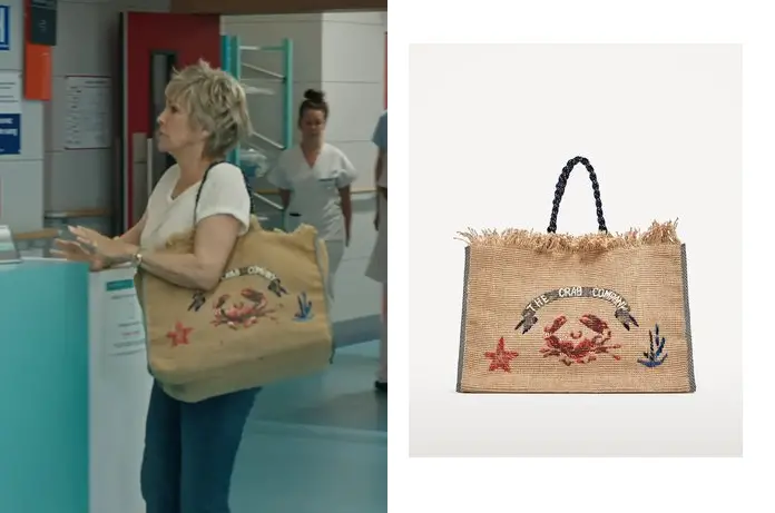 Anne-Marie Lazzari (Véronique Jannot) se précipite à l’hôpital, très inquiète, dans Demain nous appartient. Elle a un grand cabas avec le dessin d’un crabe et l’inscription « the crab company ». On le trouvait au Zara.