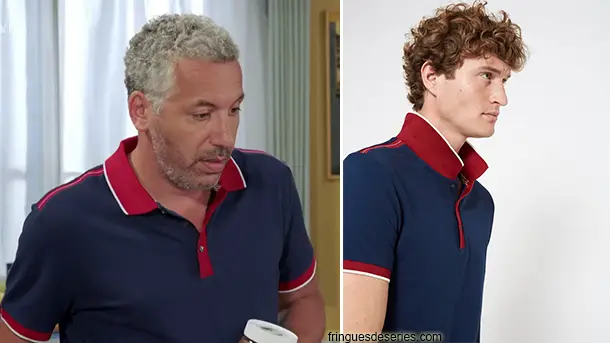 Bilel Beddiar (Atmen Kelif) prépare son anniversaire de mariage dans l’épisode 308 de Demain nous appartient. Il porte un joli polo bleu, à col rouge avec un petit liseré blanc. On le trouve ici, à -50%