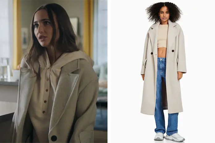 Luna Aznar (Paloma Reynaud) se rend chez Nathan dans Demain nous appartient 1372 Elle porte un long manteau sable, aux épaules tombantes.