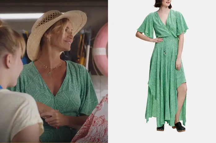 Journée détente pour Chloé (Ingrid Chauvin) dans Demain nous appartient 1237. Elle porte chapeau de paille et une longue robe verte avec un joli imprimé, des manches courtes et un décolleté en V. On la trouve ici ou ici (Belgique)