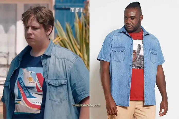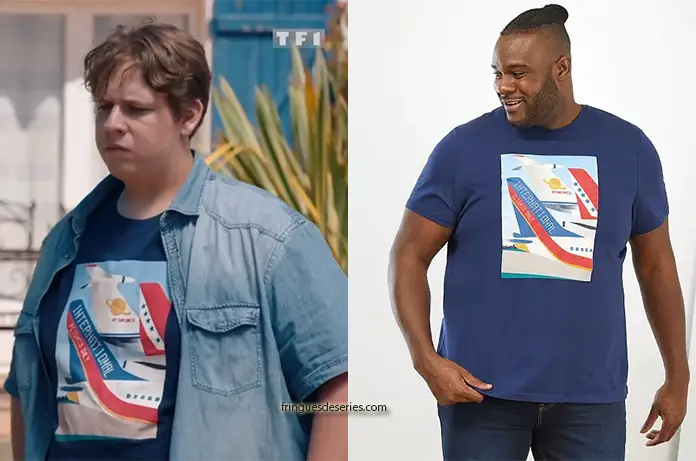 Luke (Martin Daquin) avait posé une chemise denim à manches courtes sur un t-shirt bleu avec un imprimé avion pour faire ses adieux à Laura dans Demain nous appartient.
