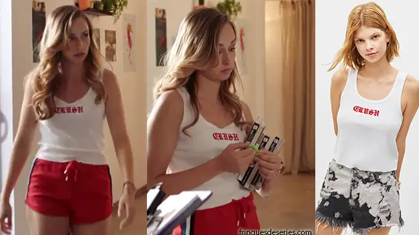 Sofia (Emma Smet) est priée de ranger dans l’épisode 500 de Demain nous appartient. Elle porte un débardeur blanc avec l’inscription Crush que l’on trouve ici. Nous n’avons pas retrouvé son short de sport rouge (avec bandes latérales), mais un très similaire se vend chez Bizzbee, ici.