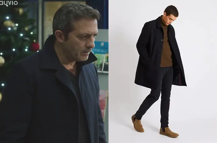 Victor (Farouk Bermouga) retrouve son fils dans Demain nous appartient 1067. Son look : un manteau bleu foncé et un pull gris foncé en cachemire. Sobre et classique. On trouve son manteau ici et le pull ici.