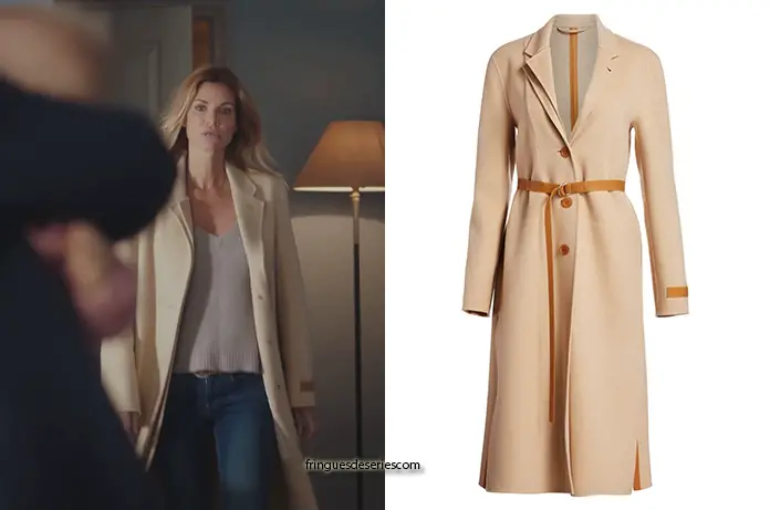 Chloé (Ingrid Chauvin) a choisi, dans Demain nous appartient 801, un manteau camel clair en laine et cachemire avec des boutons plus foncés pour l’automne. Elle préfère le laisser ouvert, sans ceinture.