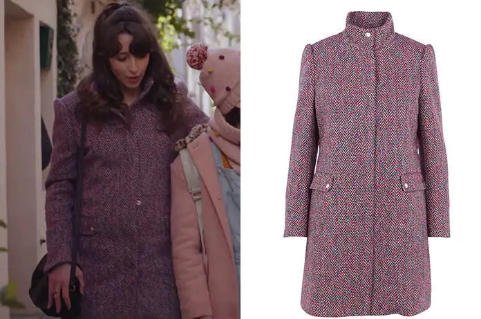 Justine (Laura Mathieu) portait un manteau à col montant dans Demain nous appartient 881. Son originalité tient surtout à la couleur, ou plutôt aux couleurs de la maille.
